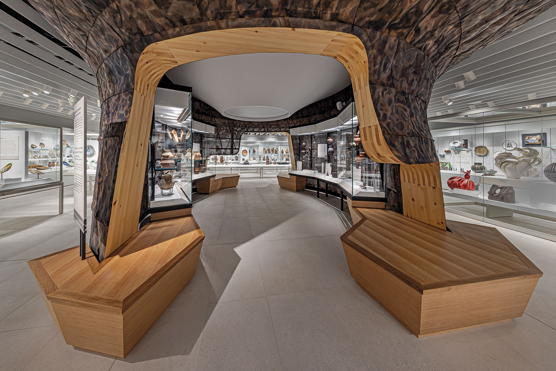 The gallery is presented in a wooden frame with a transparent copper mesh skin that serves as feathers. Architect Chris Cornelius wanted to create a “vessel that is part of the larger museum experience but also acts as a container to present the Indigenous ceramics within it.” When designing the display, Cornelius emphasized that these pieces are not artifacts of the past, but rather a continuation of Indigenous knowledge. He wanted his work to express something timeless. On the ceiling there is a 24-hour recording of the sky, compressed into 20 minutes, which gives visitors a unique and dynamic experience.