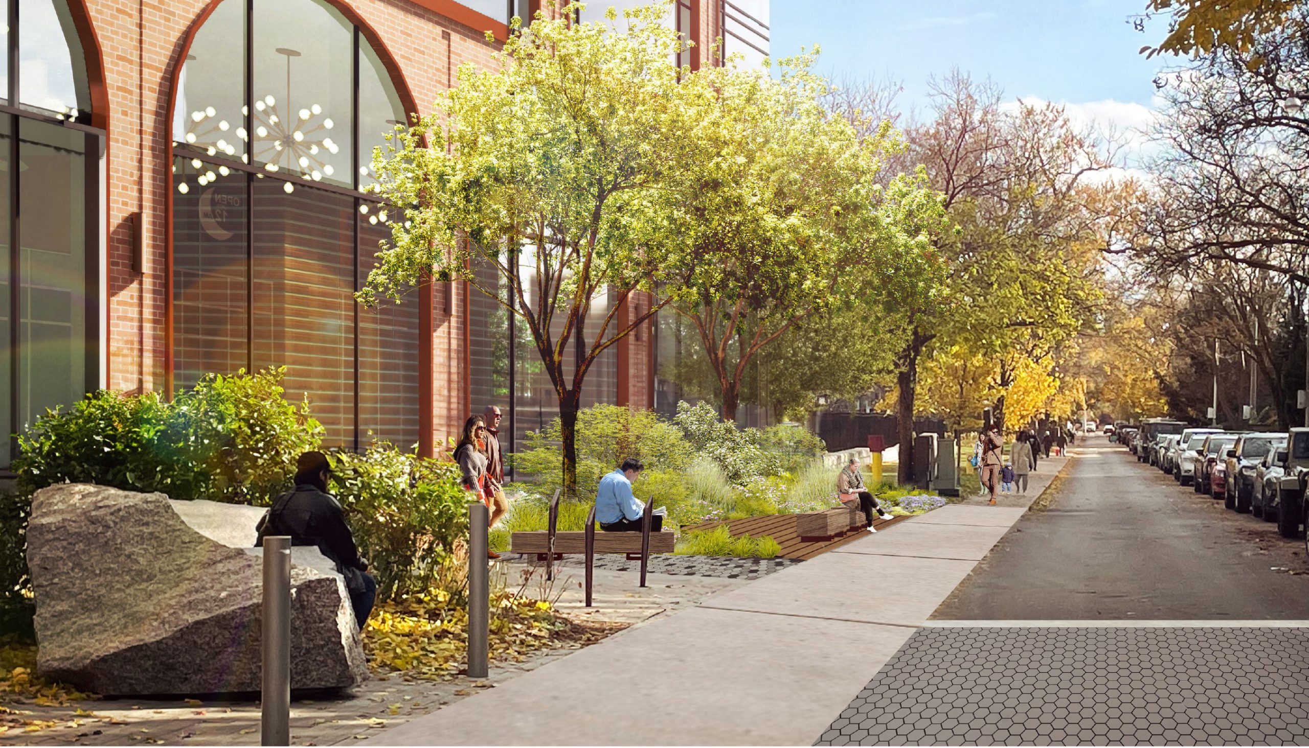 The east side of Robert Street has the existing parkette which will be expanded south and will repeat many of the elements: boulders, decking, trees, and pollinator gardens.