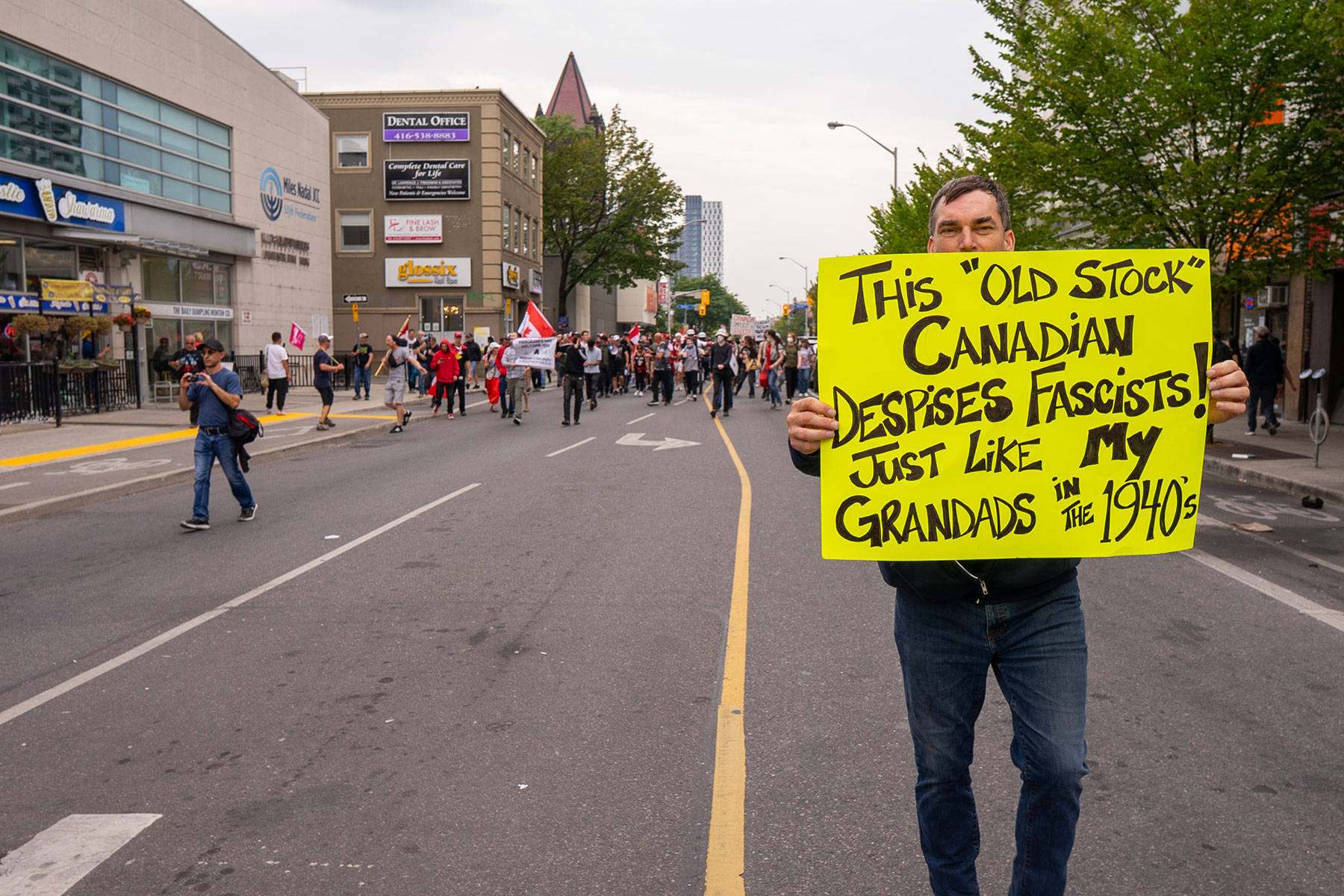 Approximately one hundred “Canada First” marchers were met by hundreds of counter-protestors in Christie Pits and as they made their way to Sankofa Square, like this one at Bloor and Spadina. NEILAND BRISSENDEN/GLEANER NEWS