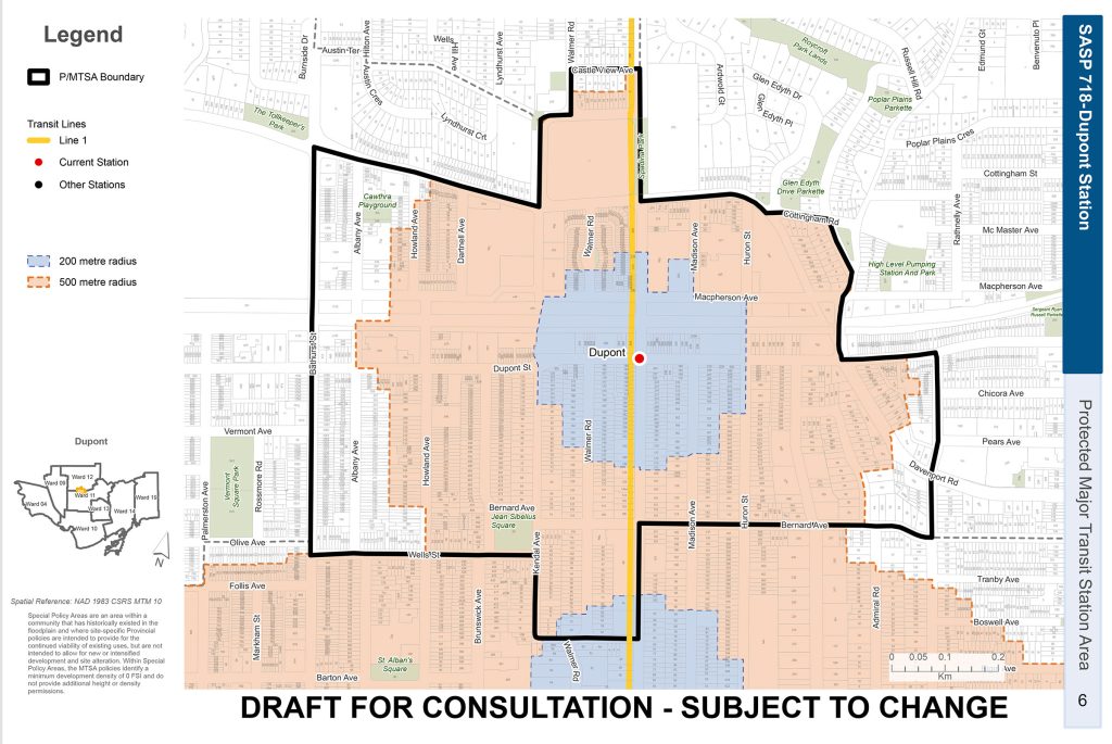 The city’s latest planning strategy involves updating neighbourhood zoning requirements to permit certain heights and densities to be built in proximity to Protected Major Transit Station Areas (PMTSAs) PMTSAs are a subset of Major Transit Station Areas, (MTSAs) which the city defines as areas within about 500 to 800 metres, or roughly a 10-minute walk, of existing or planned higher-order transit stations (subways, GO Transit, light-rail). There are currently 120 approved MTSAs across the city.