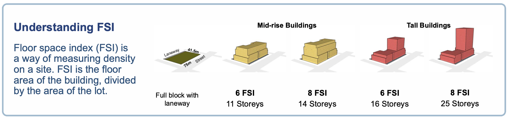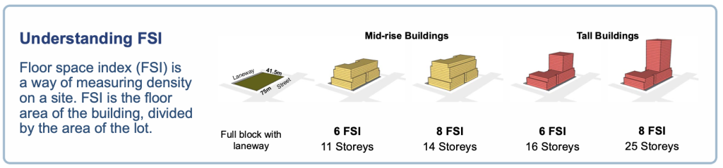 In “Mixed Use Areas, Apartment Neighbourhoods, and Regeneration Areas,” the permitted density of a structure within 200 metres of a station is a floor space index (FSI) of 8 or more. The permitted density of a structure between 200 and 500 metres from the station is an FSI of 6 or more.
