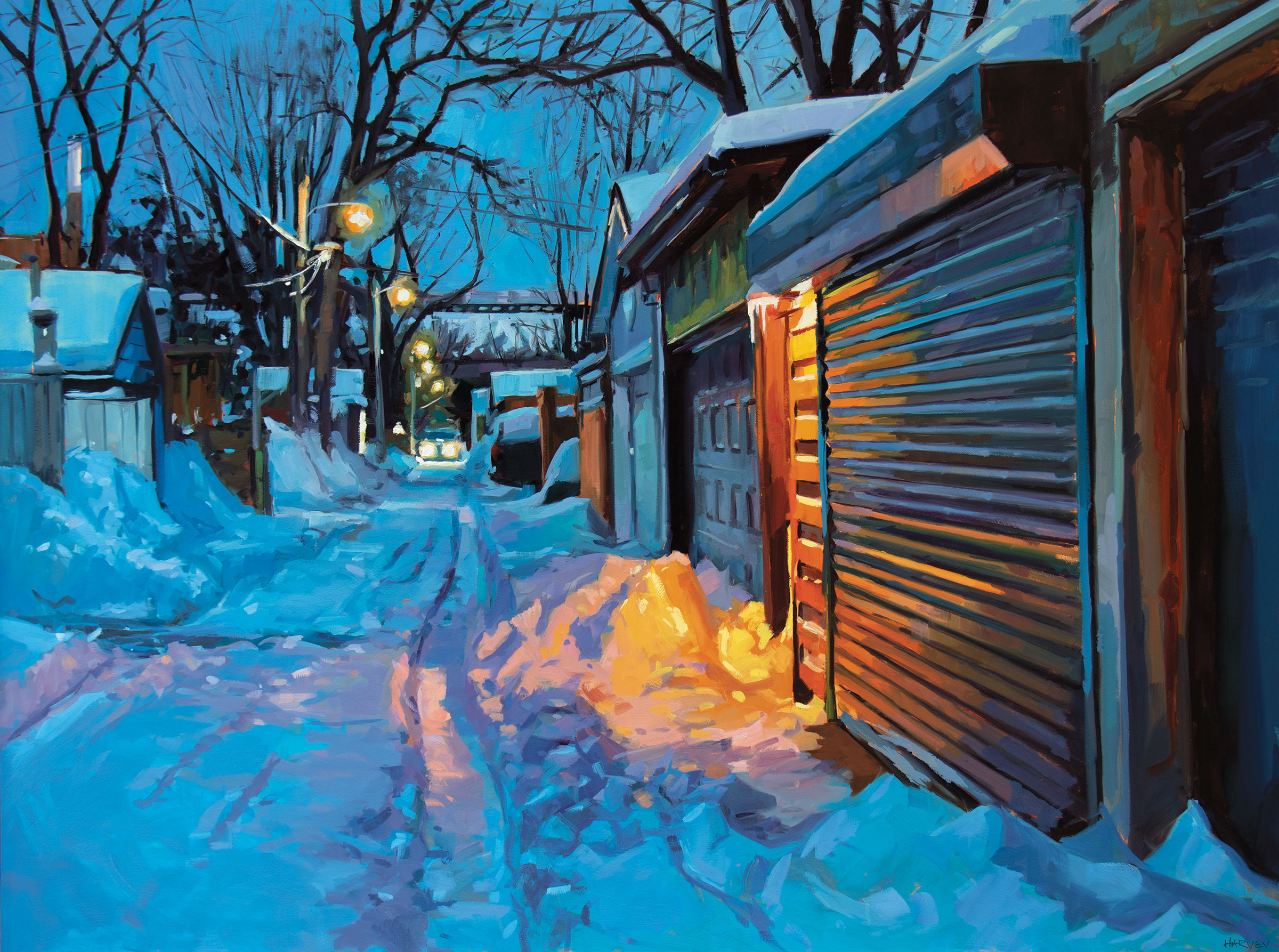 From the artist: “Beacon is a painting that came about in the aftermath of a heavy snowstorm. As the weather let up and the sky began to clear I headed out to explore the quiet of nearby alleys blanketed in new snow. I am continually drawn to the the play of light that happens in overlooked urban spaces. With this piece, the warm glow of the garage light amidst the cool end of day light drew me in. Winter in the city can be hard to love but it’s one of my favourite seasons to paint.”