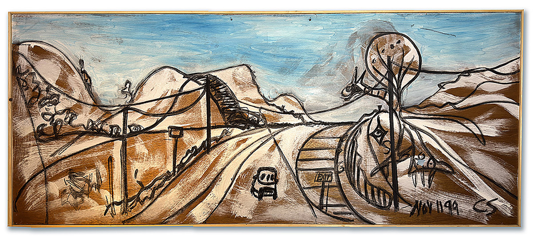 Stark’s experience hitchhiking in the Grand Cayon at age 19 is depicted in one of his favourite artworks on display titled Canyon Road.